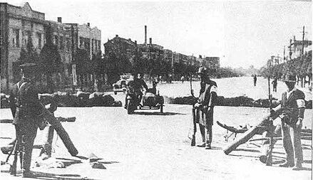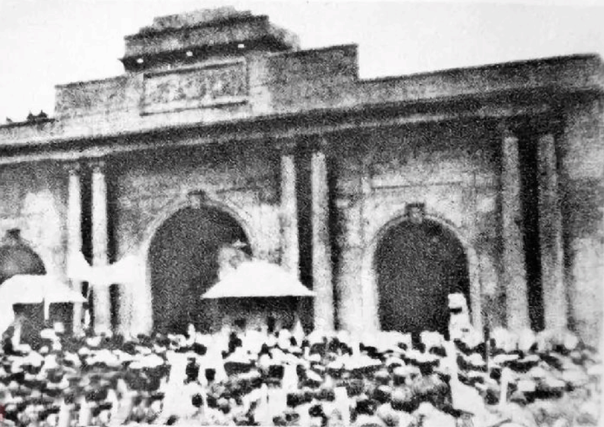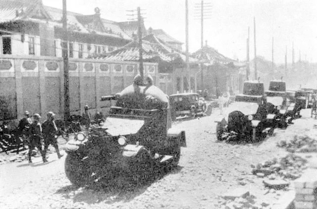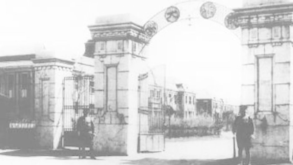 这张图片原载于日本所发行的明信片,展现的是日军侵占东北大学后,士兵在大学门前持枪站岗的画面。