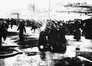 学生在游行示威时,奋起抢夺反动军警的水龙。